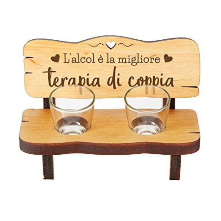 Questa graziosa panchina decorativa contiene 2 bicchierini da liquore per shottini in dolce compagniaSulla spalliera è intagliato la simpatica scritta “L’Alcool è la migliore terapia di coppia”Una stupenda idea regalo…